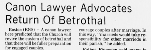 “Canon Lawyer Advocates Return of Betrothal.” The Catholic Transcript, December 30 1977. https://thecatholicnewsarchive.org/?a=d&d=CTR19771230-01.2.47.